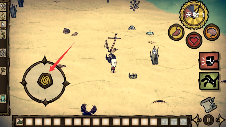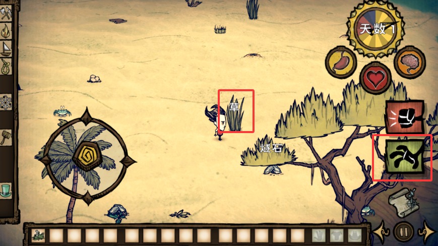 3、当靠近可用自然资源时点击右下角采集按钮,收集树枝、石块等基础生存物资。