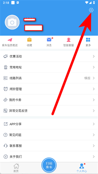 1、打开月城公交,进入个人中心页面,点击右上角设置图标。