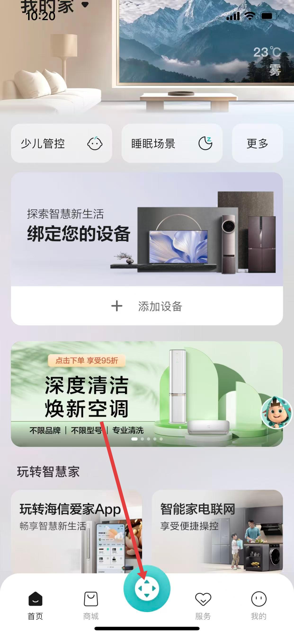 1. 打开海信爱家App,点击底部导航栏中间类似遥控器的图标。