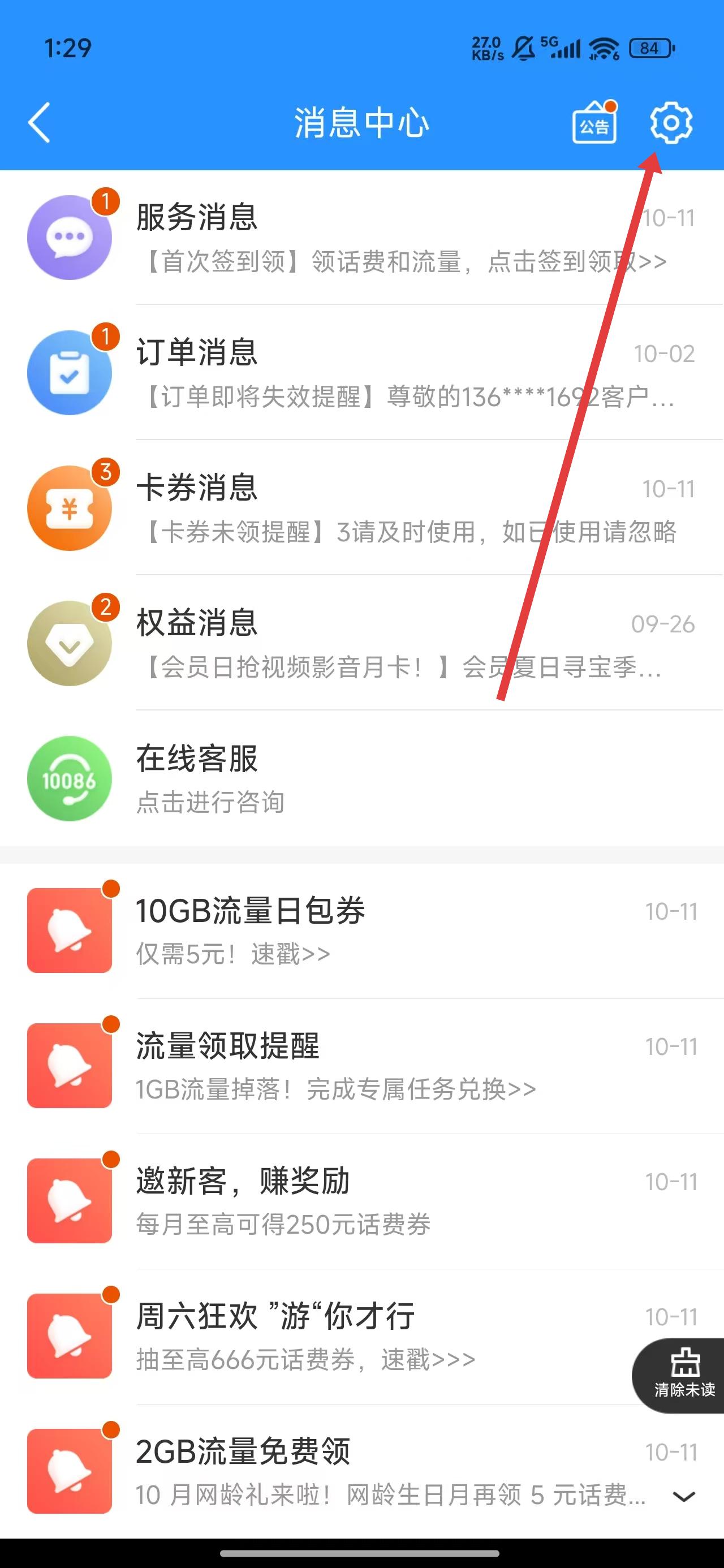 3、在进入到消息中心页面,可以点击右上角齿轮图标,进行设置操作。