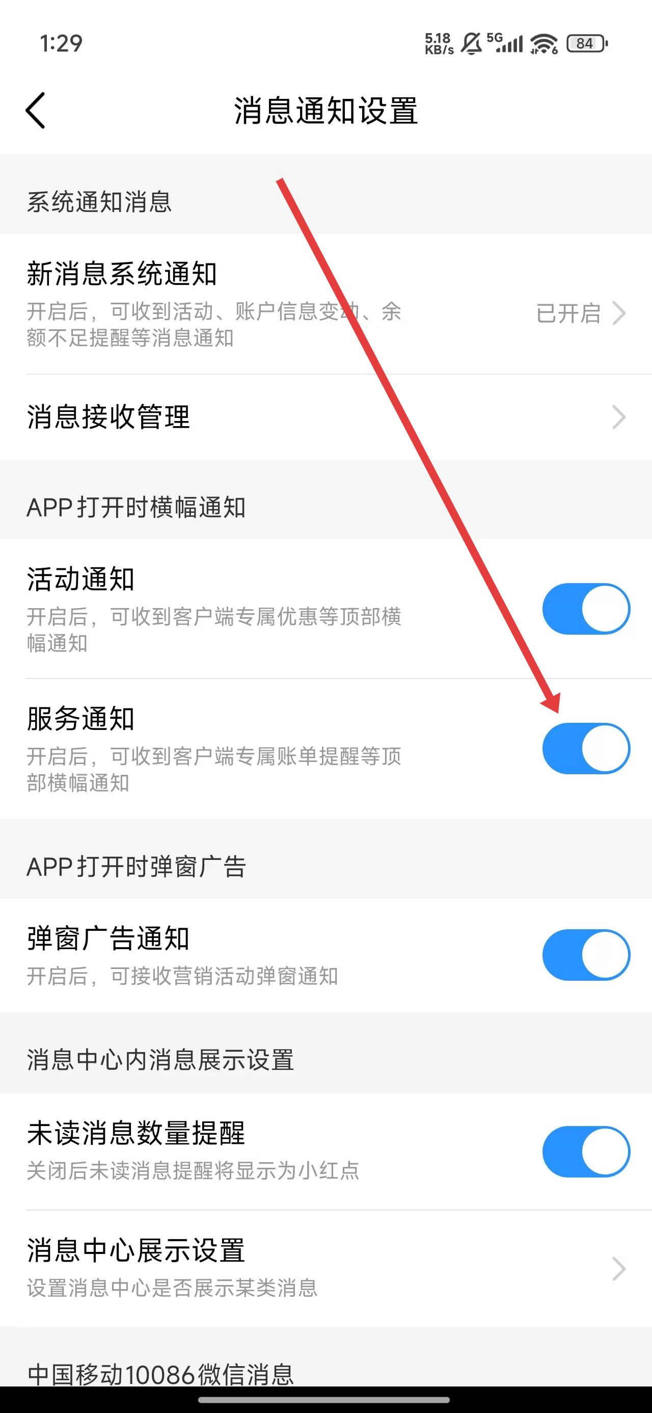 4、进入到消息通知设置页面后,若想取消服务通知功能,可以点击开关按钮,关闭该功能。