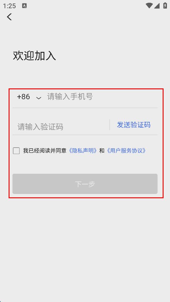 4、输入验证码,勾选“我已经阅读并同意隐私声明和用户服务协议”,然后点击“下一步”按钮。