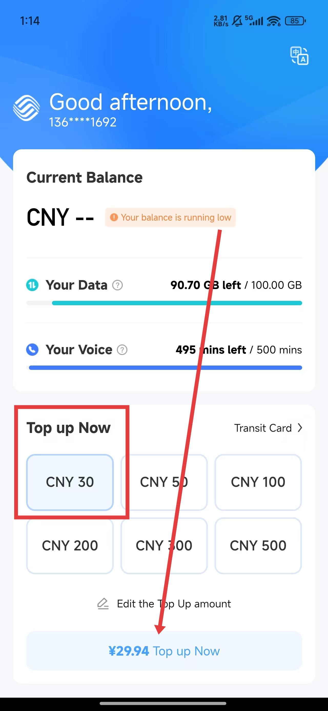 3、在进入到英语模式中,可以选择要充值话费的金额,点击底部按钮进行支付操作。