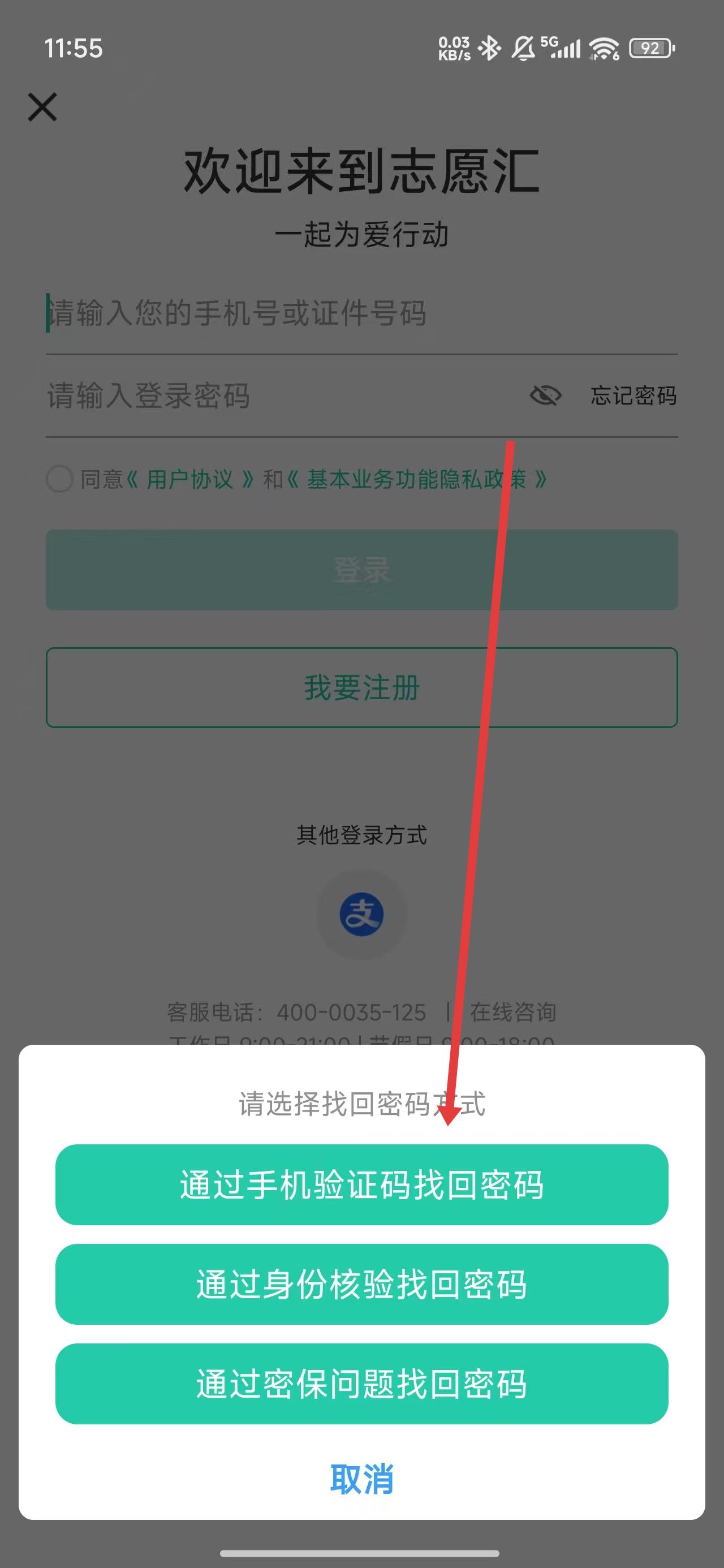 答:点击【忘记密码】,如有绑定手机号码选择