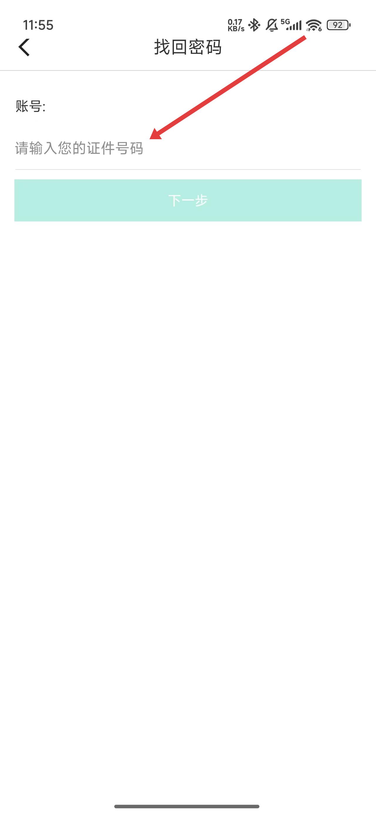 2、在进入到找回密码页面中,需在输入框中填写身份证号码,验证后进入下一步。