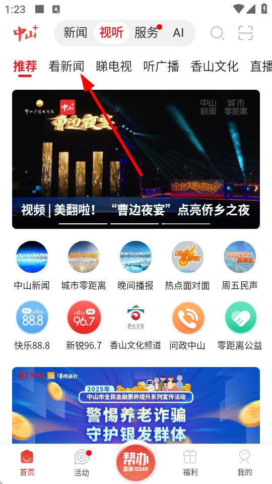 2、在首页界面上方导航栏点击视听下的看新闻选项。