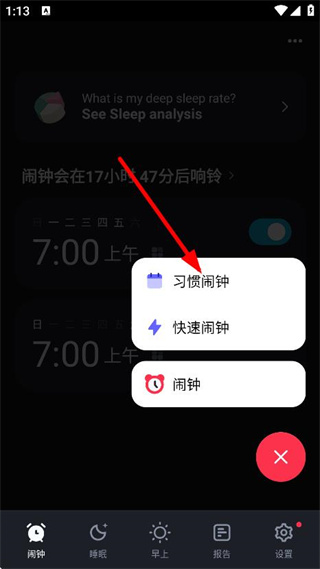 2、在闹钟类型选择框中,点击习惯闹钟,进入设置页面。