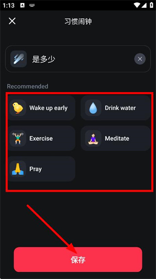 3、选择推荐的习惯选项后,点击保存,设置好习惯闹钟。