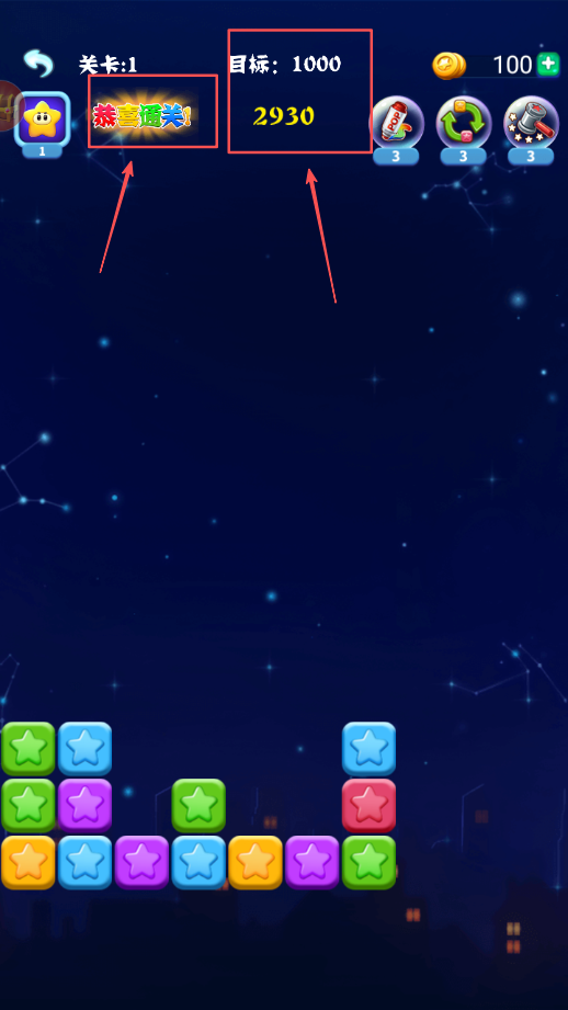 1、通过点击消除相同颜色星星积累分数推进关卡进度发展,体验消除乐趣和成就感收获积累过程,感受游戏进程发展和技能提升价值意义实现重要性。