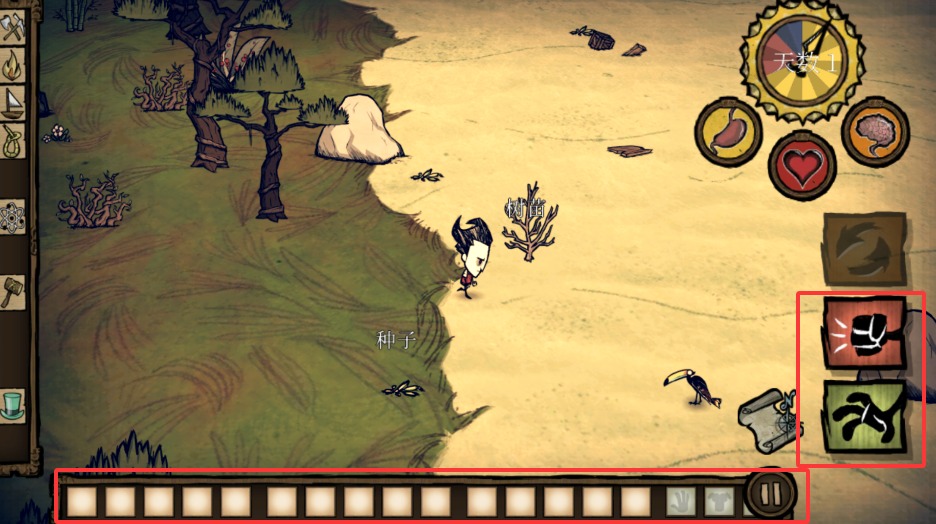 4、通过滑动屏幕控制角色移动探索,使用右下角交互键进行采集与狩猎,底部显示物资库存。
