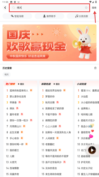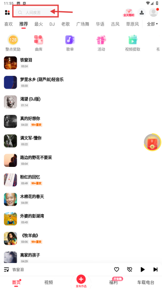 1、打开音乐类应用,点击顶部搜索框,激活输入状态。