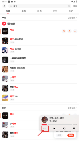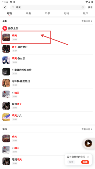 3、在音乐列表中,选择心仪歌曲如彩铃小助手版晴天,点击进入播放界面。