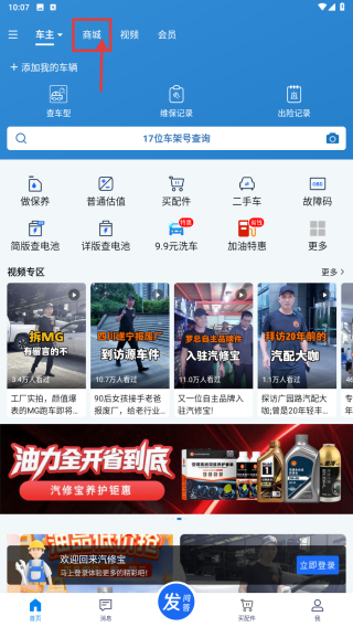 1、打开汽车服务类应用,点击顶部商城选项,进入配件商城页面。