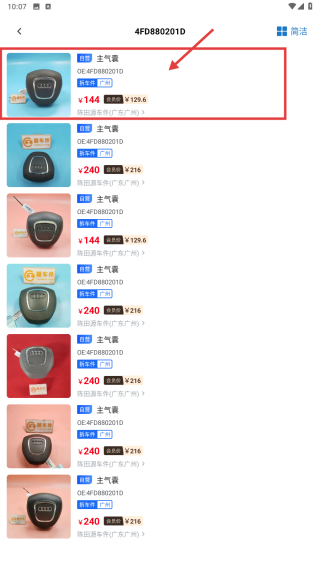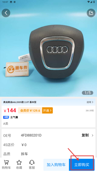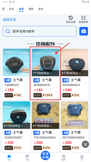 2、在商城热销配件区,找到奥迪主气囊商品,点击进入详情页。