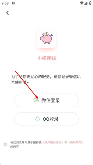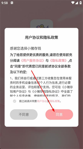 1、打开小猪存钱,在弹出的隐私政策界面点击同意。