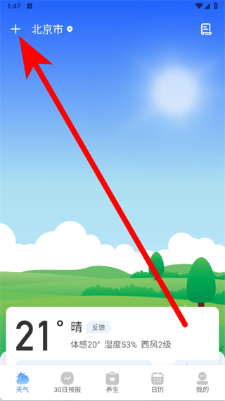 1、打开及时雨天气预报,点击左上角+。