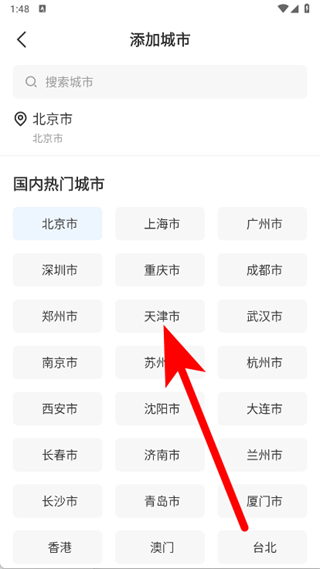 3、进入添加城市页面,点击天津市。