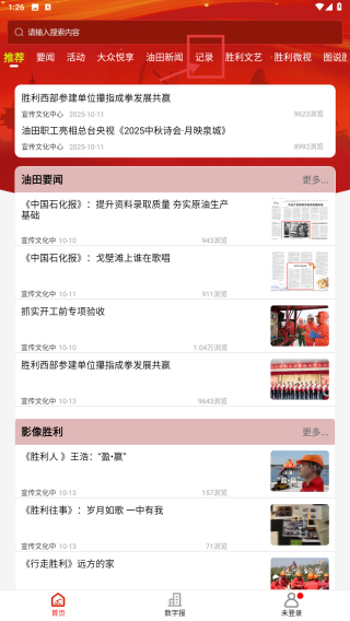 1、打开新闻类应用,点击顶部记录标签,进入记录板块内容页面。
