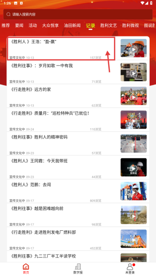 2、在记录板块,找到胜利人王浩:盈·赢新闻条目,点击进入新闻详情页。