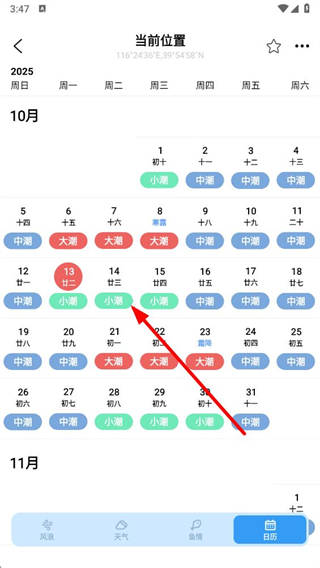 3、在日历界面中,可看到不同日期标注的潮汐情况,标识了小潮、中潮、大潮等信息。