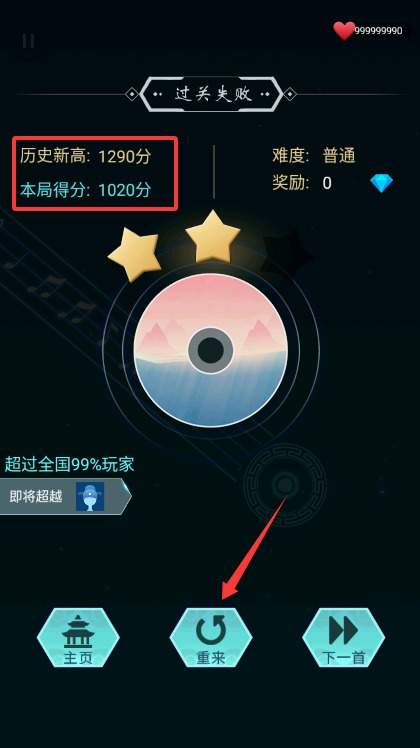 4、每曲结束后可查看详细得分数据,选择重新挑战或解锁下一首曲目继续游戏。