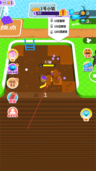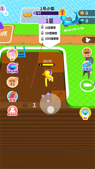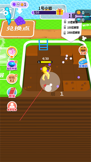 1、进入游戏,查看1号小镇进度1/10,操控角色在第1层挖掘。