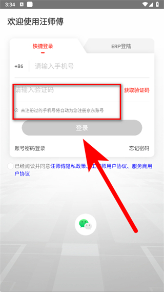 3、在快速登录页面,输入手机号后,点击获取验证码。