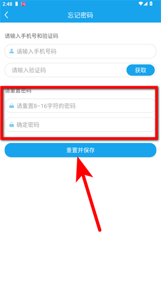 3、输入验证码,设置8-16字符新密码并确认,点击重置并保存,完成密码重置。