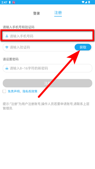 2、在注册页面,输入手机号码后,点击获取验证码。