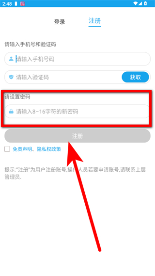 3、输入验证码并设置密码,勾选协议后点击注册,完成注册。