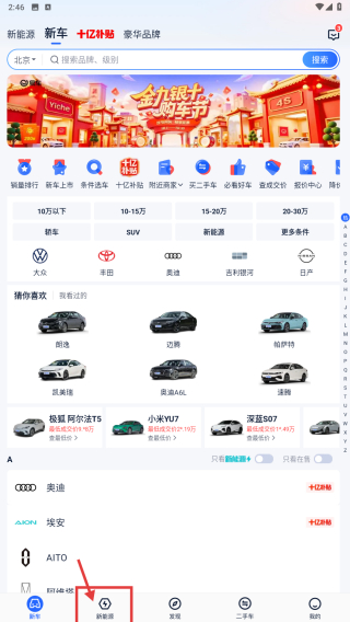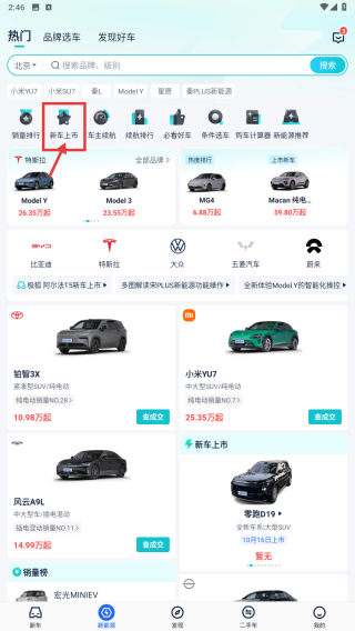 1、打开汽车类APP,点击底部选车选项,进入选车页面后,点击新车上市分类,查看近期上市的新车列表。