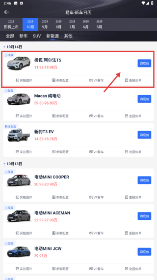 2、在新车上市列表中,点击极氪阿尔法T5车型条目,进入该车型详情页面。