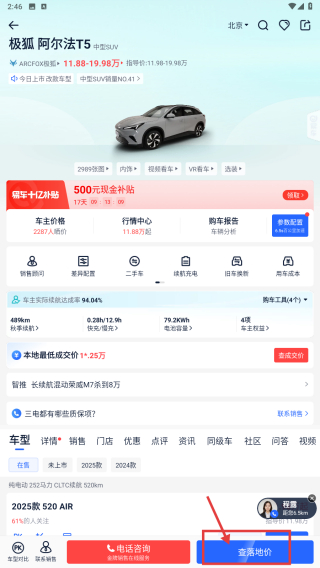 4、若需进一步了解购车优惠或经销商报价,在车型详情页面点击查落地价按钮,即可查看具体的价格明细及优惠政策。