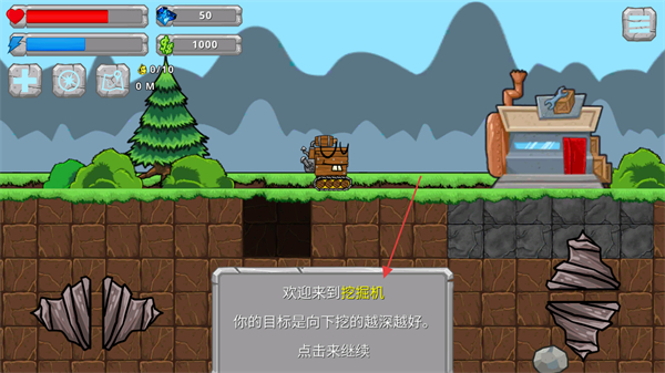 1、进入游戏,阅读提示信息,明确目标是操控挖掘机向下挖得越深越好,点击屏幕继续游戏。