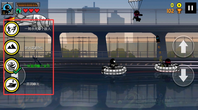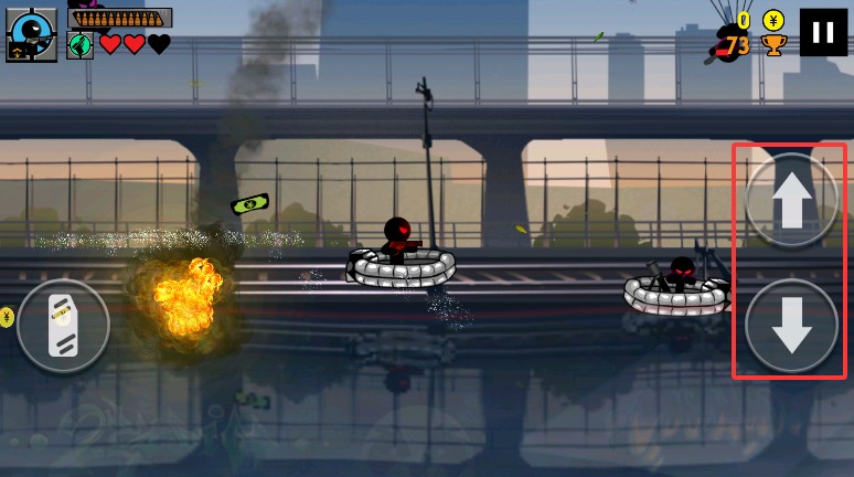3、通过右侧上下方向键控制火柴人跳跃与下蹲,灵活躲避障碍与敌人攻击。