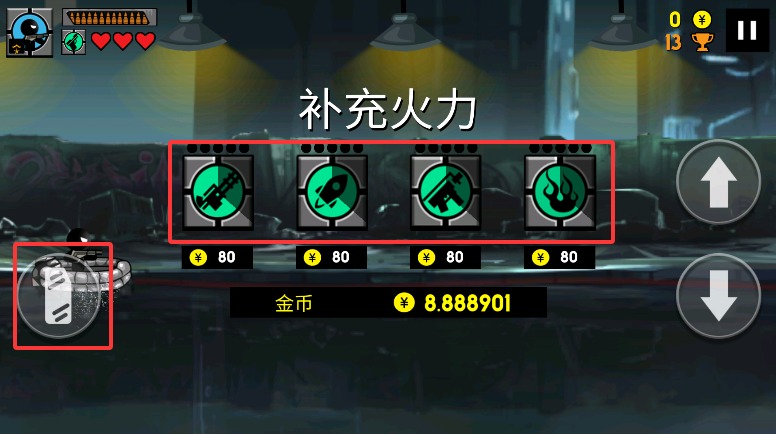 4、点击左侧商店按钮购买武器与补给,增强火力应对逐渐提升的关卡难度。