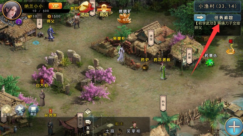 3、点击右上角任务栏接取各类委托任务,使用追踪功能自动寻路至目标地点。