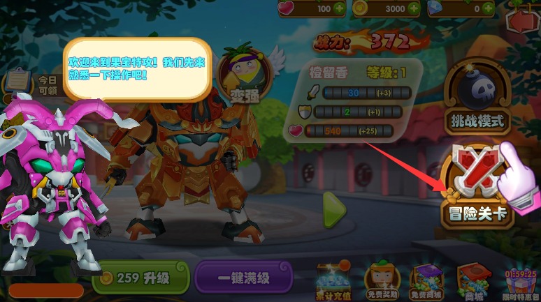 2、在主菜单选择冒险关卡模式,开启果宝英雄们对抗邪恶势力的精彩旅程。