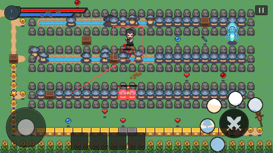 1、选择喜欢的关卡开始游戏,使用虚拟摇杆控制角色移动避开怪物攻击范围。
