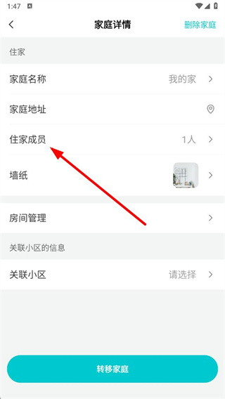 4、在家庭详情页面,点击住家成员选项,进入家庭成员页面。