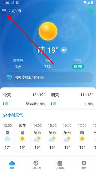 1、打开当准天气app,点击左上角的城市选择图标,进入城市管理页面。