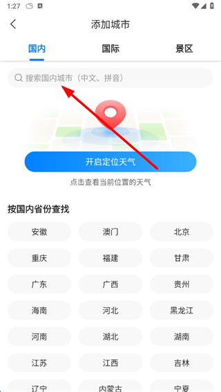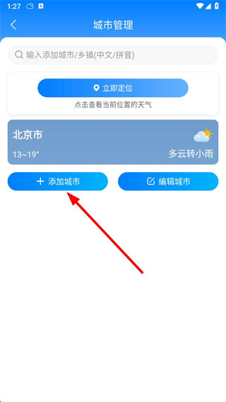 3、在添加城市页面的搜索栏中,输入要添加的城市名称。