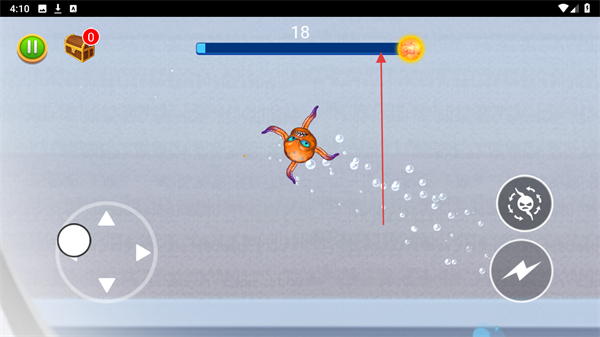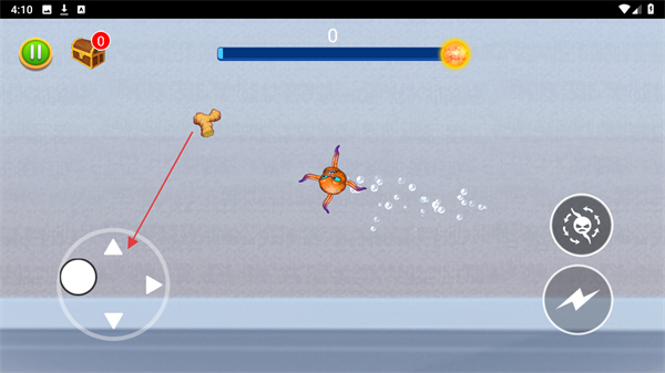 2、利用屏幕左侧的虚拟摇杆控制八爪鱼的移动方向,碰到食物如骨头状物体就去吞噬,增加进度条数值。