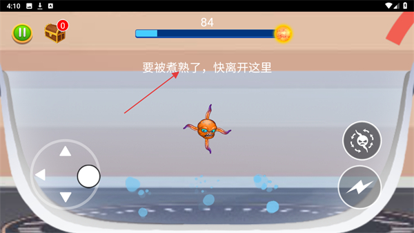 4、当看到提示要被煮熟了,快离开这里,尽快操控八爪鱼逃离当前危险区域,继续寻找食物吞噬,争取获得更高分数。