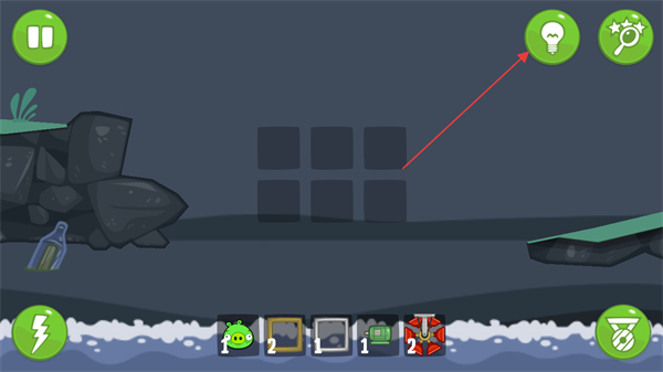 1、进入关卡,场景较暗,点击右上角灯泡图标获取过关提示,查看可使用的道具,如小猪、方块、机械装置等。