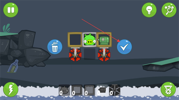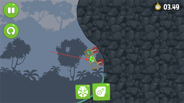 4、启动搭建好的载具,在限定时间如03.49内,让小猪利用载具越过障碍到达目标地点。