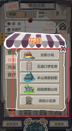 是一款休闲的模拟小游戏,游戏真实的模拟创业的过程,玩家要在年轻的时候在商场打拼,开始贩卖各种东西来维持生计,然后慢慢涉及各行各业,努力的坚持不一定有好的回报,但是只要苦心经营,相信总有一天你会一飞冲天的。