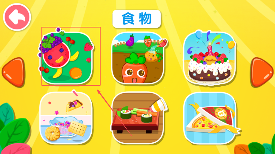 1、进入游戏后首先选择感兴趣的主题场景开始认知学习,从食物、动物、交通工具或家电等类别中挑选,了解不同物品的基本特征和用途。