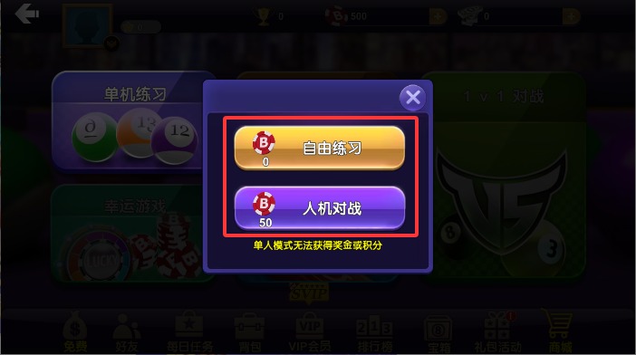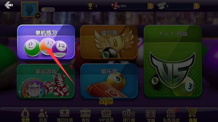 1、启动游戏后选择单机练习模式,即可进入这款模拟真实物理效果的台球游戏。