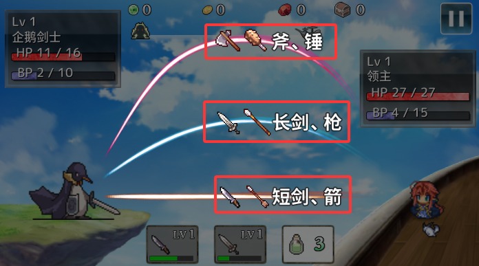 1.游戏中双方丢出不同的武器来互相伤害,每件武器有着不同的耐久,当双方投出了轨迹相同的武器时,比拼的便是武器的耐久度。